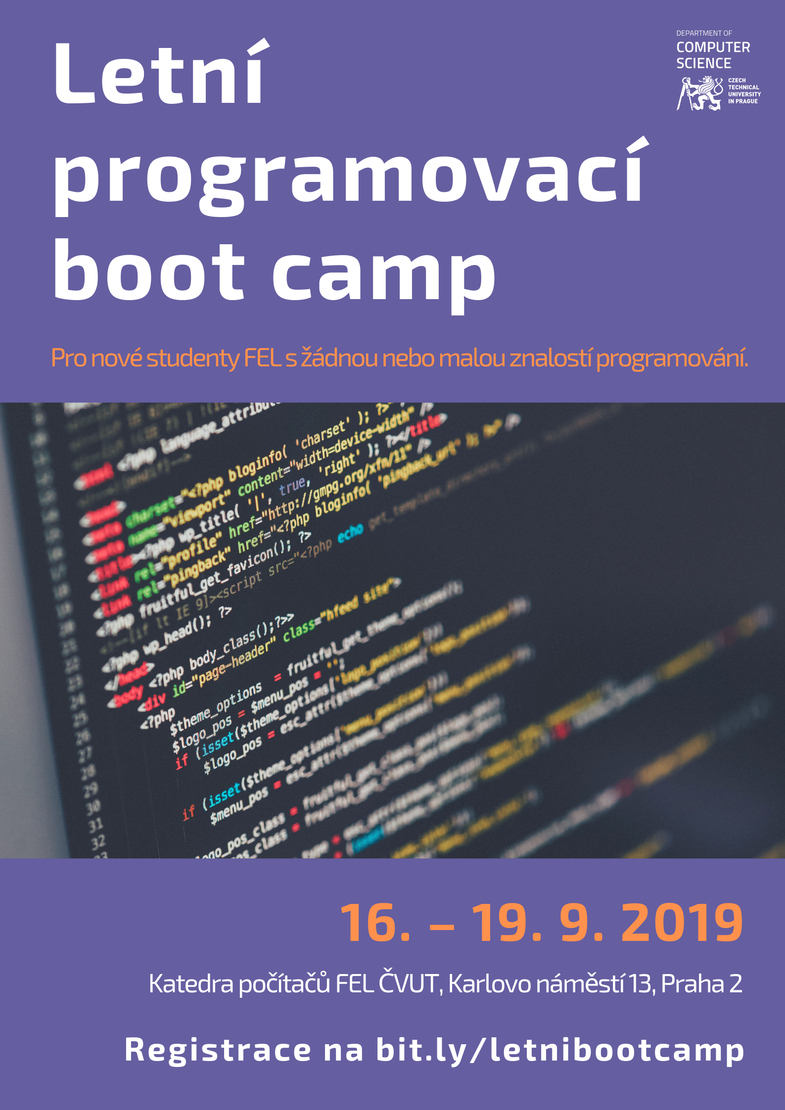 Letní programovací bootcamp je soustředění pro nové studenty FEL s žádnou či velmi malou předchozí znalostí programování. Cílem boot campu je získat vhled do řešení úloh programování, rozvinout u vaše programátorské myšlení a osvojit si programátorské základy spolu s ovládáním počítače tak, abyste byli připraveni na cvičení během semestru. Díky absolvování našeho kurzu zlepšíte svou startovní pozici ve výuce programování v prvním semestru vašeho studia.