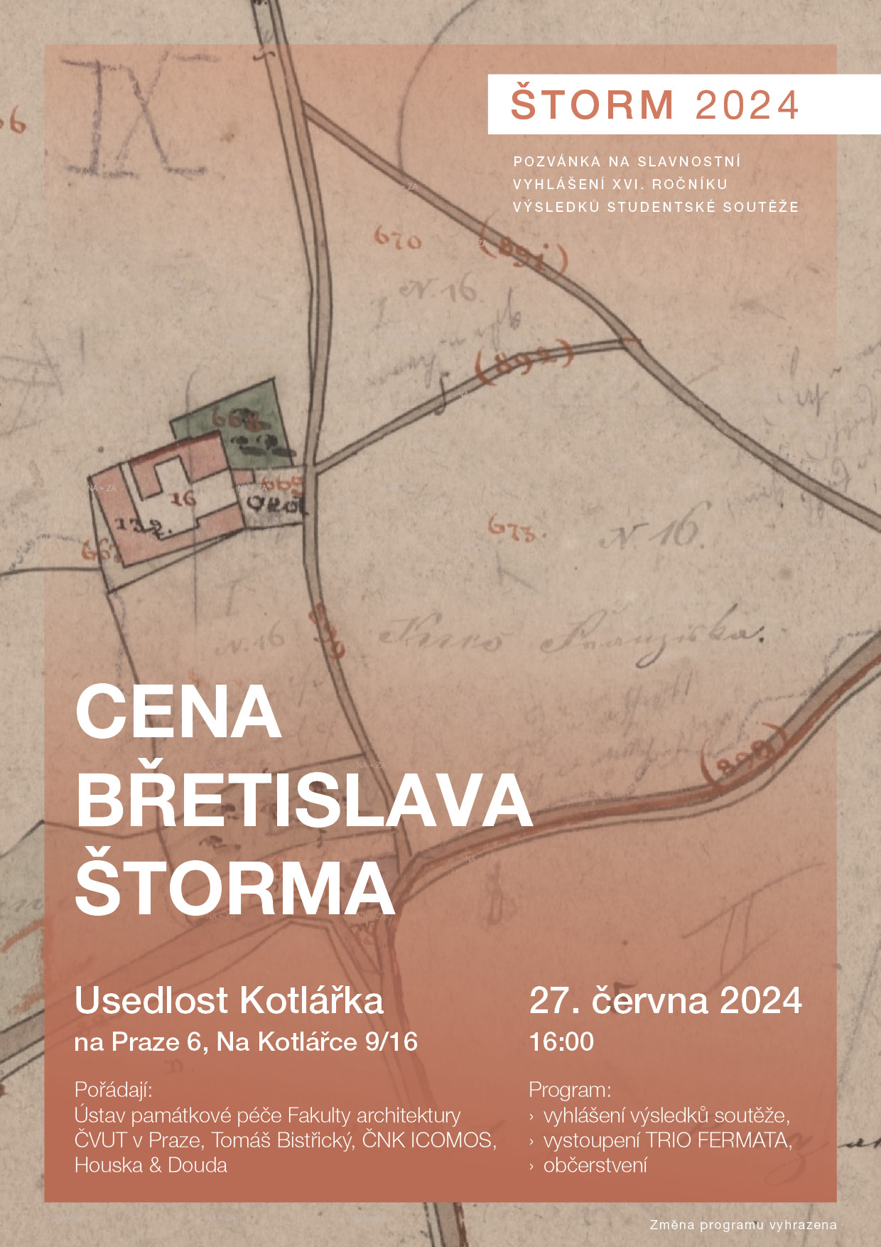 Ústav památkové péče zve na slavnostní vyhlášení studentské soutěže Cena Břetislava Štorma. Slavnost se bude konat 27. června v 16 hodin v usedlosti Kotlářka.